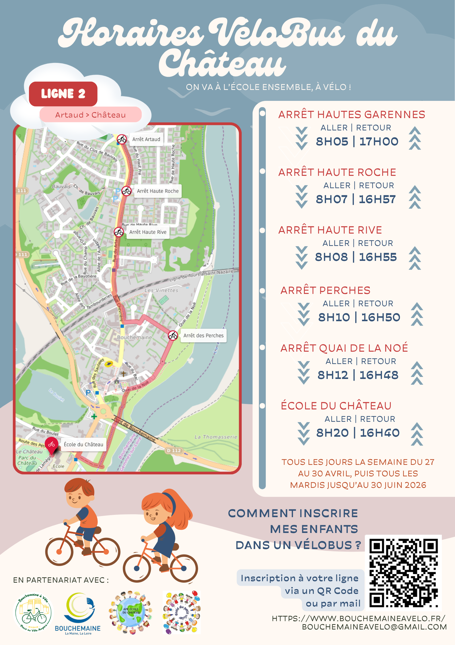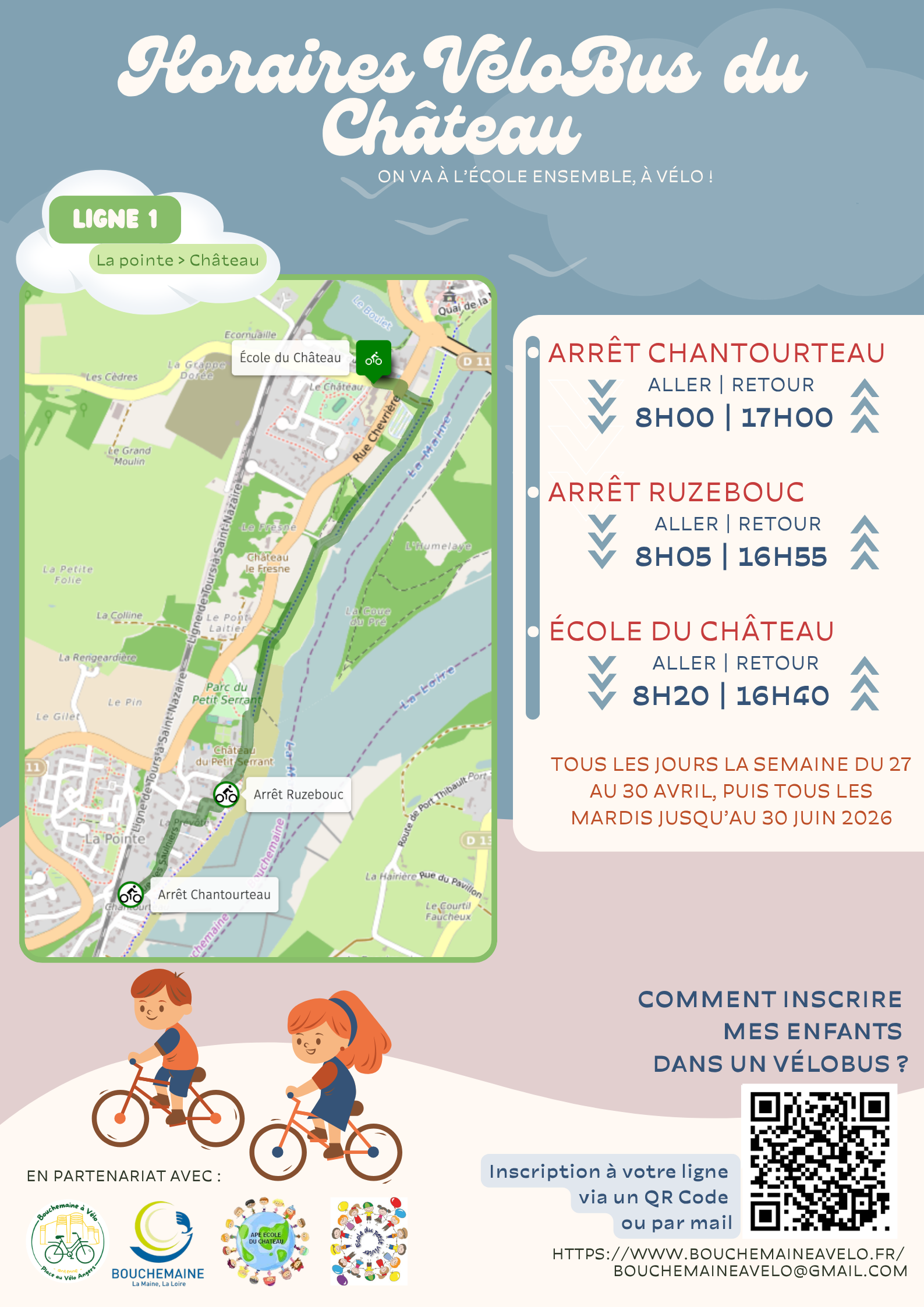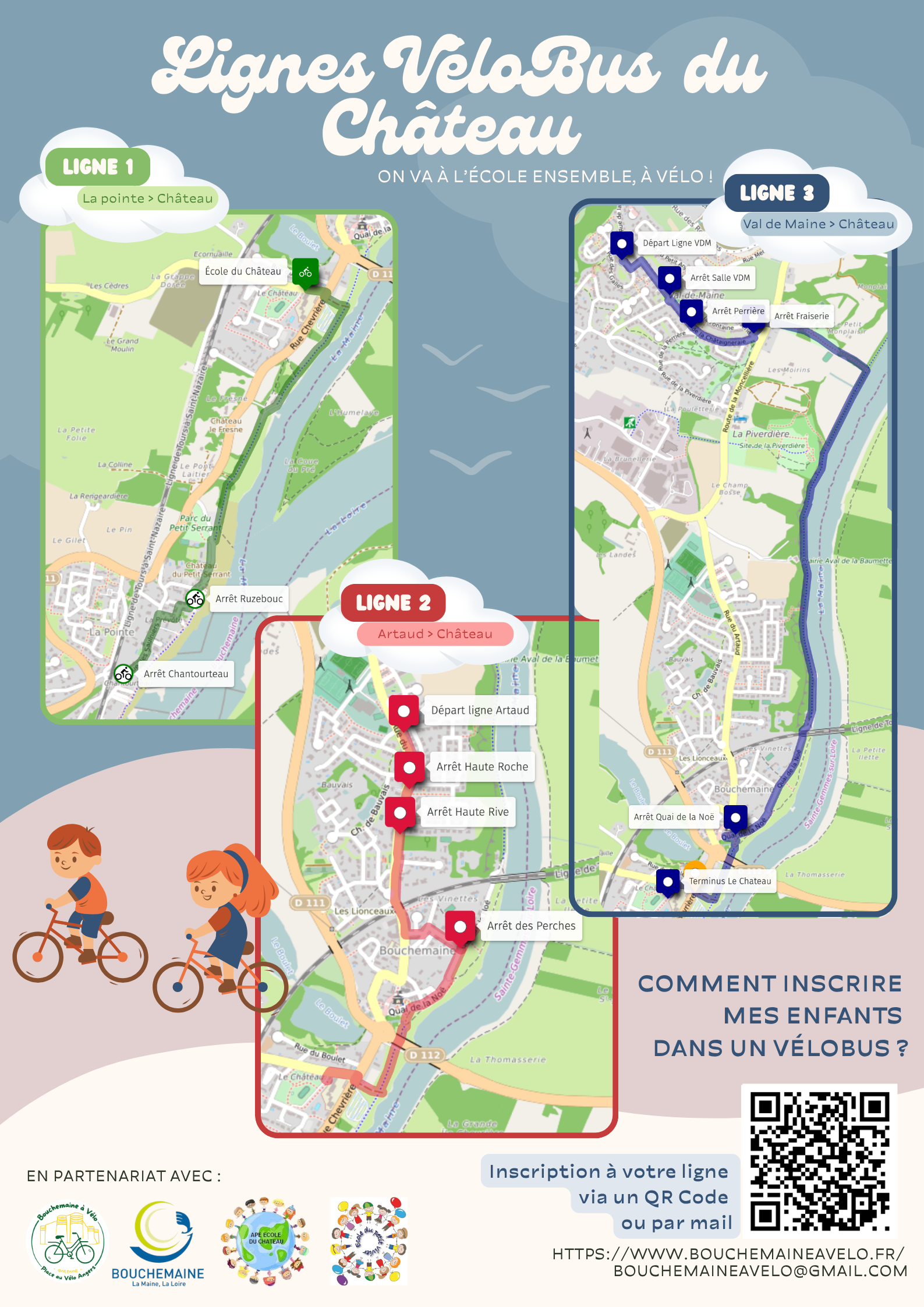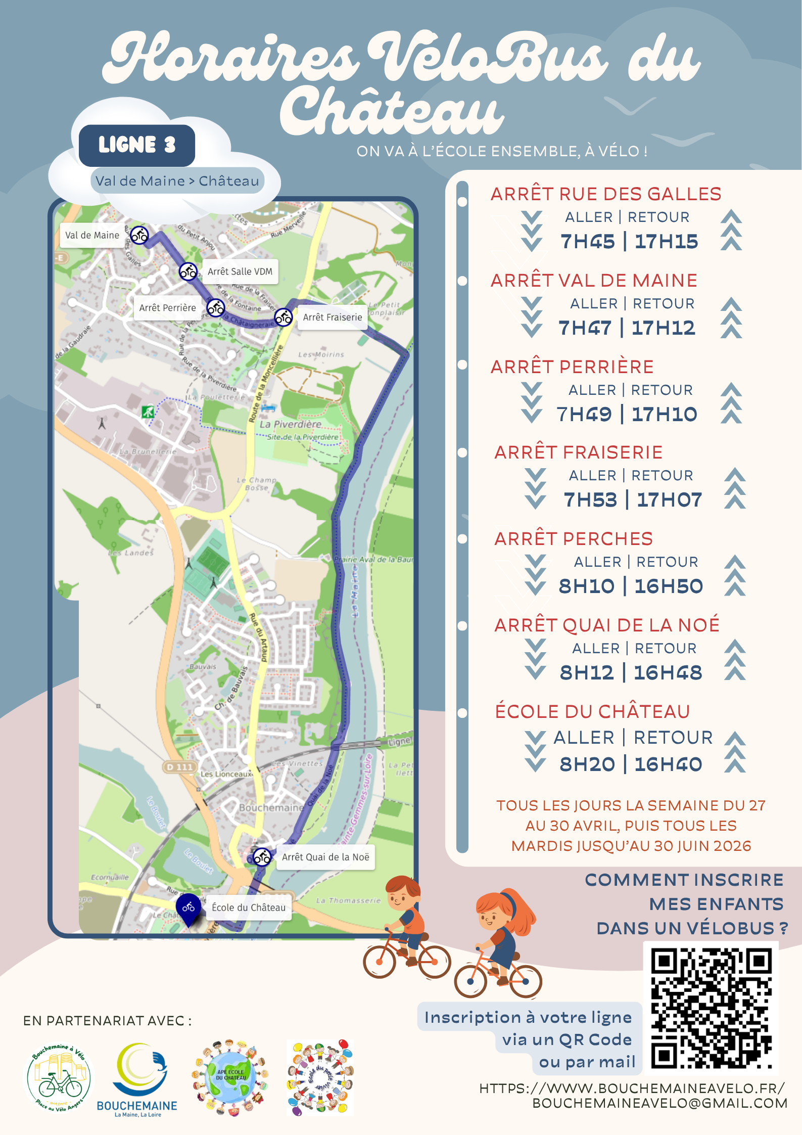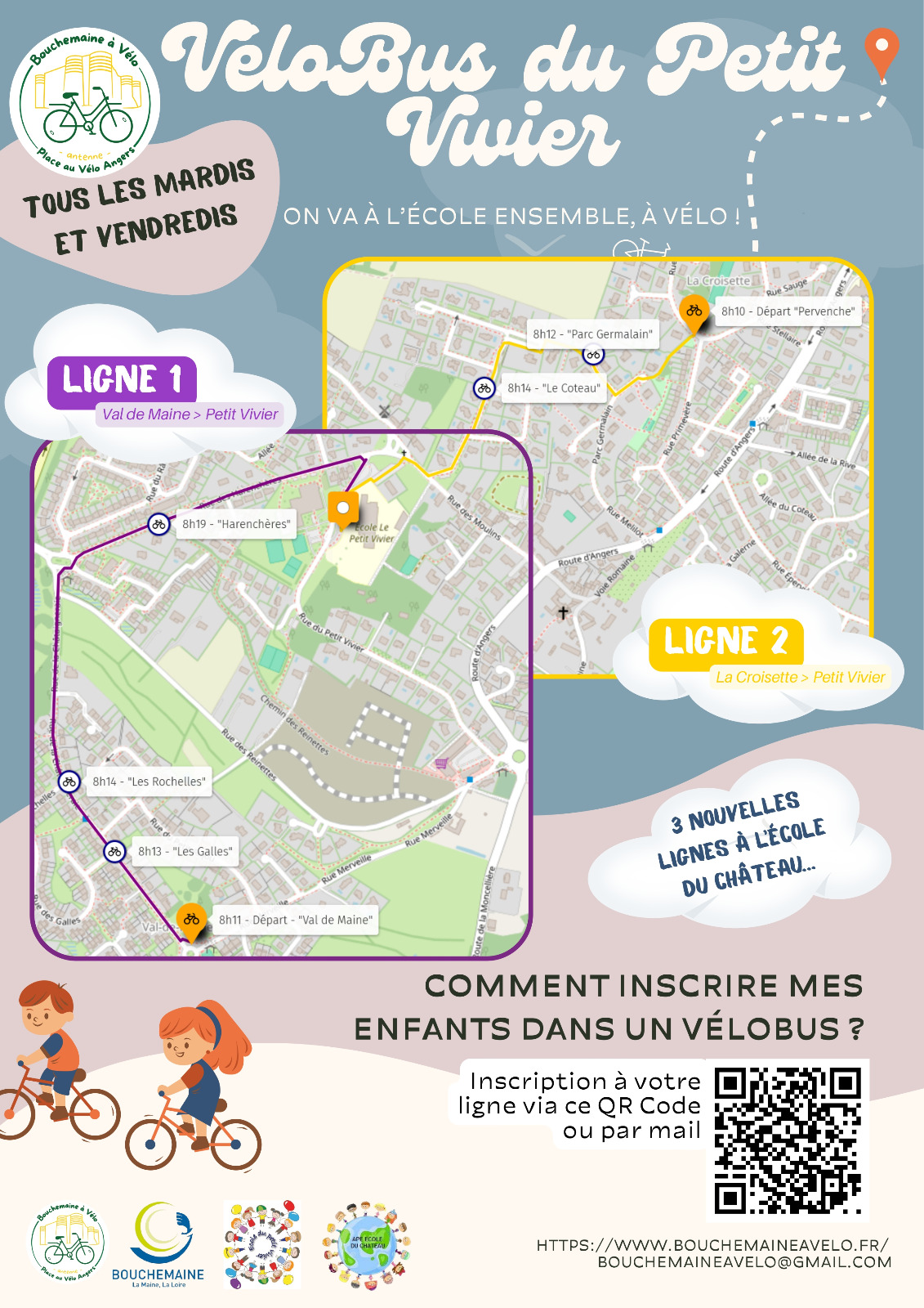 Le dimanche 26 avril 2026, Bouchemaine à Vélo vous donne rendez-vous pour la Fête du Vélobus et le lancement des nouvelles lignes de l’école du Château.